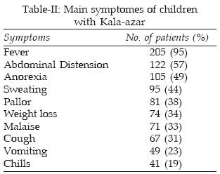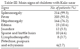Fever and splenomegaly were present in >95% of the patients (Table-III). Hepatomegaly were seen in 76% and edema in 10% of the cases, but Lymphadenopathy was found in only 3.7% of the children. Table-IV shows the hematolagic features of the children.