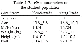 One hundred cases of newly diagnosed type 2 patients were studied. All of them were between 30 years to a maximum of 70 years of age. In the glibenclamide group, the mean age was 45.8+8.8 years, while in the repaglinide group the mean age was 46.6+10.5 years, as mentioned in Table-I. Male to male ratio was different in both groups. In glibenclamide group (N=50), 10 were males (20%) and 40 were females (80%), while in the repaglinide group (N=50), 16 were males (32%) and 34 were females (68%). On the whole there were 26% males and 74% females in the study. The mean weight of repaglinide group was 65.8+9.4 kilograms, while that of repaglinide group was 72.7+17 The mean height of the patients in glibenclamide group was 1.6+0.5 m, while that of repaglinide group was 1.54+0.5. Body mass index (BMI) of glibenclamide and repaglinide groups was 30.4+5.6 and 27.1+3.5 respectively. All these observations are tabulated in Table-I. In repaglinide group the mean dosage used was 4.27 mg/day and in glibenclamide group it was 8.8 mg/day.