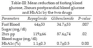 Mean fasting blood glucose values of patients put on repaglinide at the start of the study was 171+53, at six months 124+26 and at the end of one year, it was 106+11. In glibenclamide group, at the start it was 140+56, at six months 116+18 and at the end of one year 105+12.7. All values in mg/dl. Therefore, the mean reduction of fasting blood glucose level in repaglinide group was 64+53 and glibencl- amide34.7+53 (P=0.007) (Table–II & III).