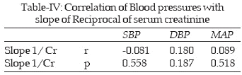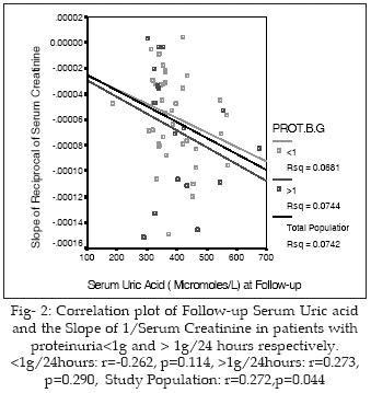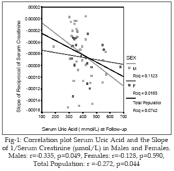 Progression of kidney disease: The rate of progression of the nephropathy was estimated by the plot of the reciprocal of the serum creatinine against time that gave a slope of -0.00531 +0.000354 dL/mg per month for the study population. Although there was no gender difference in the plot of reciprocal of serum creatinine against time the plot of the slope against serum uric acid revealed significant differences between male and female patients (male r = - 0.335, p = 0.049, female r = -0.128, p = 0.590) (Fig-1). There was a significant correlation between the slope of the reciprocal of serum creatinine and serum uric acid for the study population (r =0.272, p=0.044) (Fig-2). The slope of the reciprocal of the serum creatinine did not correlate significantly with the age of the patients (r = -0.108, p = 0.431) or cigarette smoking habit. There was no significant difference between the proteinuria at presentation and on follow up for the study population as a whole or between males and females. In addition the slope of the reciprocal of serum creatinine however did not significantly correlate with either proteinuria at presentation (r =-0.059, p =0.67), proteinuria at follow up (r = -0.074, p = 0.59) or with cholesterol at follow up (r = 0.046, p = 0.738). Over the follow up period neither the systolic blood pressure, the diastolic blood pressure nor the mean arterial blood pressure correlated with the slope of the reciprocal of serum creatinine (Table-IV).