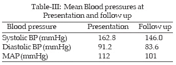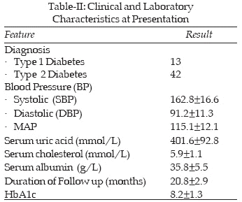 Patients Characteristics: Fifty-five patients (35 males, 20 females) suffering from diabetes and impaired renal function constituted the study population. Forty-two of the patients had type 2 diabetes while 13 had type 1 diabetes. The patients were aged between 39 and 82 years with a mean age of 64.9 +10.8 years (Table-I). The majority of the study population was made up of white Caucasians (50 in number) while the rest were Asians4 (4 in number) and a black African1 (one patient). Table-II shows the clinical and biochemical features of the study group at baseline. There was no statistical difference between the sexes with regards to their mean age, blood pressure levels the length of follow up, the urinary protein excretion rate and lipids levels. We compared the mean blood pressures at presentation and on follow up (Table-III).