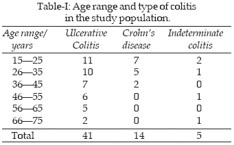 The age range and the type of the IBD in the study group is shown in Table-I .The duration of the bowel symptoms ranged from 2 months to 15 years (mean 4.32 years). Age ranged from 15 years to 75 years (mean 37.14 years) (Table-I).
