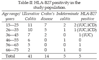 Results: Only five patients of the IBD group (4 females and 1 male) showed HLA-B27 positivity. Three patients had ulcerative colitis (UC) and 2 patients had Crohn’s disease (CD). Three of the patients in IBD group had active disease and were on steroids the other two were in remission and were on aminosalicylic acid (5-ASA) only. Three patients of the controlled group (all females) showed HLA-B2 positivity. Two of the patients in the IBD group were of European origin.