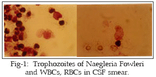 An eighteen months old boy from a rural area with a history of nausea, vomiting, fever, drowsiness and convulsion for 3 days was admitted to the children hospital in August 2001. He had the history of puddling in pond water in the southwest of Iran. In primary physical examination, he was drowsy and febrile (rectal temperature, 39.9°C), with respiratory rate of 70/min, pulse rate of 130b min, and blood pressure of 85/50mmHg. Meningeal signs were positive, but no focal neurologic signs were observed. The patient was responsive to the painful stimuli. An intact sensory, hypotonic motor and decreased deep tendon reflexes were noticed. The pupils were equally sized and reactive to light. Fundoscopy and other general examinations were unremarkable. The primary diagnosis was bacterial meningitis. The first examination of cerebrospinal fluid (CSF) revealed a turbid fluid with 12000/mm³ leukocytes predominantly neutrophil (83%), 1000/mm³ RBC, 238mg/dl protein and 34mg/dl glucose. Concomitant blood sugar was 100mg/dl. Gram staining and culture of CSF for bacteria were negative. In microscopic examination of CSF, motile trophozoites of amebae were observed. Fig-1 shows the amebae stained with Giemsa.