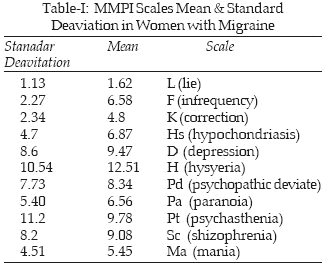 Method: The sample group of this cross-sectional study included 96 adult patients suffering from migraine who were randomly selected to be tested by Minnesota Multiphasic Personality Inventory (MMPI), from which eight personality scales (hypochondriasis, depression, schizophrenia, psychopathy, paranoia, psychasthenia, hysteria and mania) were reviewed.