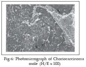6The commonest age group was found to be 21-30 years. Out of 256 cases of GTD the commonest was HM 242(94.5%). The second commonest was invasive Mole 9(3.5%) and the least common was Choriocarcinoma with 5(1.95%) cases. HM(Fig-1,2)was commonest in the age group of 21-30 yrs. Invasive mole (Fig-3,4) was the commonest in age group 31-40 and Choriocarcinoma(Fig-5,6) in age group 21-30 yrs (Table-I).