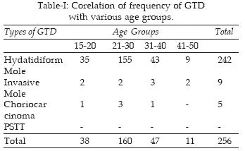 7 There is also confirmatory evidence of influence of age on the incidence of gestational trophoblastic diseases.8In our study highest frequency of gestational trophoblastic disease was found in the age group 21-30 years with the mean age of 27 years. The mean age (27 years) is in accordance with that reported by Mungan