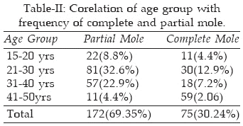 Out of 242 cases of HM, 172 (69.35%) were partial mole and 75(30.24%) were complete mole. Partial mole was commonest in age group 21-30 while complete mole was commonest in age group 41-50(Table-II).
