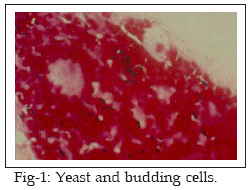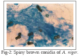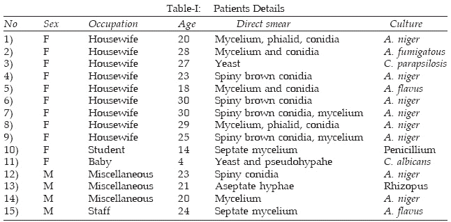 This report includes 15 patients with otomycosis. Mycelial elements, branching mycelium, fruiting heads and brown spiny conidia were observed in 12 samples. In the direct smears of 8 patients and growth besides in the culture medium showed A. niger. In direct smears of 4 patients septate branching mycelium conidia were seen and isolated species from the culture medium were as follow A. flavus (2 cases), A. fumigatus (1), Penicillium Spp.(1). The direct smears of two patients showed yeast cells, budding cells and pseudohyphae while in the culture medium C. albicans and C. parapsilosis had grown respectively. Broad aseptate mycelia were also seen in direct smear and yielded Rhizopus Spp. in culture. (Table-I)
