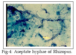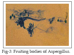 Fifteen patients attending at the Jahad and Razi Laboratories supposed to be suffering from disease were involved in this investigation. It included 11 female (73.3%) and 4 males (26.7%). The ages of the patients ranged between 4-30 years with a mean of 17 years. All patients had one or more of the aural symptoms (itching, otalgia, hearing loss). Secretion and pus were collected from the ear by two sterile cotton wool swabs. One swab was used for direct microscopy and other for culture examination. Direct examination of the samples was carried out by staining the smears with methylene blue and Gram techniques. Otomycosis was confirmed by the presence of aseptate mycelium, septate mycelium, Aspergillus conidia, fruiting bodies, yeast and pseudohyphae (Figs 1-4). The presence of fungal elements in stained smears was re-confirmed by fungal culture fungal colonies. Any kind of clinical materials, especially liquid samples (swabs, pus) should be examined as quickly as possible. Swabs did not require processing and were directly used for culture. Swabs were rolled and inoculated over the surface of Sabouraud’s Dextrose Agar with chloramphenicol (SC). Cultures were incubated at laboratory ambient (25-27°C) for 2-3 weeks, aerobically. Fungal isolates (moulds) were identified on the basis of colonial morphology and slide cultures. Yeast colonies, also detected by germ tube test, production of chlamydoconidia on corn meal agar and API 20 C AUX system.