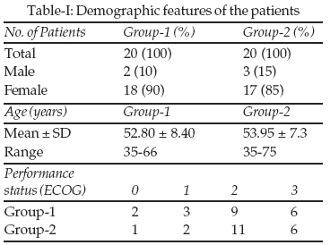 In Group-2 twenty patients (3 males and 17 females) with stage IV disease were enrolled according to the inclusion and exclusion criteria. The female to male ratio in this group was 8.5:1.5