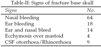 and CSF otorrhoea/rhinorrhoea (Table-II). Seventeen patients (8.5%) had history of post-traumatic seizures. Ninety two patients had mild head injuries, seventy six had moderate and thirty two had severe head injuries.
