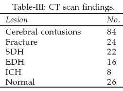 Cerebral contusions were the most common findings on CT scan followed by skull fracture, SDH, EDH and ICH respectively (Table-III).