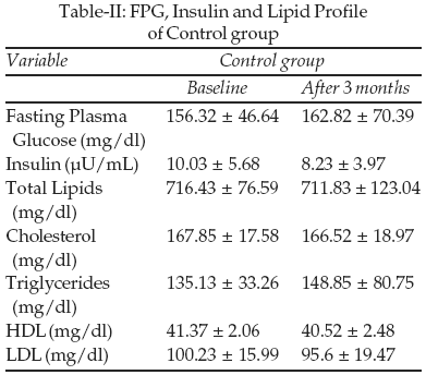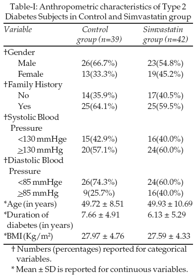 Table-I shows the anthropometric and biochemical characteristics of the subjects in the control and simvastatin treated groups at the start of the study. The proportion of male and female in both the groups was similar. Proportions of subjects having positive family history of diabetes and blood pressure in both the groups were also similar. Both groups had similar ages, duration of diabetes, body mass index and serum creatinine levels.