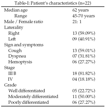 From Sep 2002 to May 2004, twenty two patients of squamous cell carcinoma were enrolled in the study. Twenty one patients were male and only one was female. In 13 (59.09%) patients the lesion was present in the right lung and remaining had disease on the left side. Patient characteristics are given in Table-I.