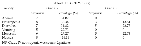 All the twenty two patients completed the planned treatment. Complete response was not achieved in any patient. Partial response was seen in 15 patients (68.18%), stable disease in five patients (22.73%) and progressive disease was seen in two patients (9.09%). Grade-II and III toxicity profile is given in Table-II. Common Toxicity Criteria Grade-II nausea was seen in eight patients (36.36%), vomiting in five patients (22.73%) and mucositis in six patients (27.27%). Grade-III neutropenia was observed in three patients (13.64%) and Grade-III mucositis and diarrhea in five patients (22.72%) each. Grade-IV neutropenia was seen in two patients (9.09%).
