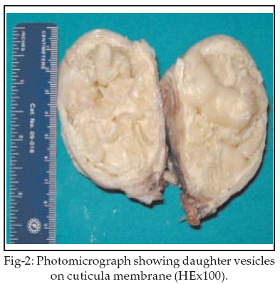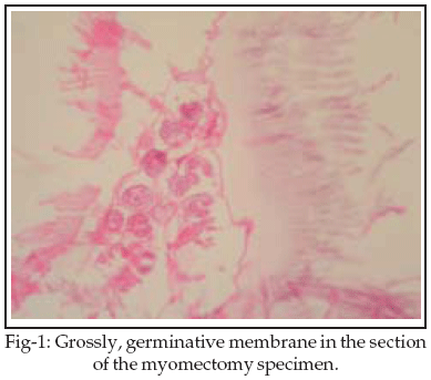 Histologic examination of the cyst wall revealed that its was composed of a germinative membrane, cuticular layer, fibrous capsules and its lumen contained daughter vesicles (Fig-2). The inner layer contained white coloured chitin and was composed of a germinal epithelium. Thus, the patient was diagnosed as having a hydatid cyst of the uterus leiomyoma during pregnancy. The preoperative examination did not detect hydatid disease: a condition discovered following histopathologic examination of the specimen. Indirect hemagglutination (IHA) test was carried out postoperatively had a negative result. The x-ray chest, abdominal ultrasound and pelvis were normal. The patient was discharged from the hospital after the operation and we gave per oral albendazole (Biofarma, Turkey) 200 mg/d divided in 4 equal doses to her for 6 months in order to prevent any recurrence of the disease.