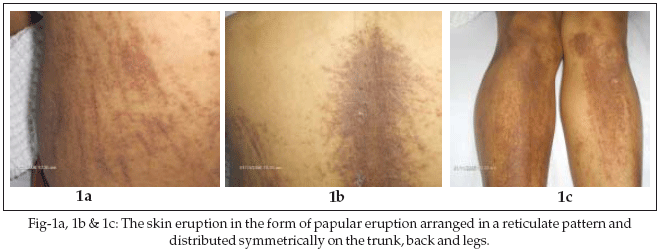 On examination, she looked pale, febrile (temperature 39.2ºC), had non-suppurative pharyngitis and generalized lymphadenopathy. The lymph nodes were slightly tender, small and discrete. The cardio-respiratory, abdominal and neurological systems were normal. There was no evidence of active arthritis. The skin eruption was in the form of pruritic papular eruption arranged in a reticulate pattern and distributed symmetrically on the face, neck, trunk and legs (Figs-1a, 1b, 1c).