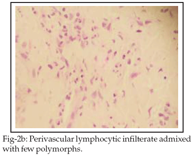 Chest X-ray, ECG, abdominal ultrasound, echocardiography, intravenous urogram did not reveal any abnormalities. CT scan chest, abdomen and pelvis revealed discrete axillary, para-vascular, aorto-pulmonary, left para-aortic lymphadenopathy. Cervical lymph node biopsy revealed reactive lymphadenitis. Bone marrow examination was consistent with anemia of chronic illness with no evidence of hematological malignancies or lymphomatous infiltration. Skin biopsy was consistent with PP (Figs-2a, 2b, 2c, 2d).