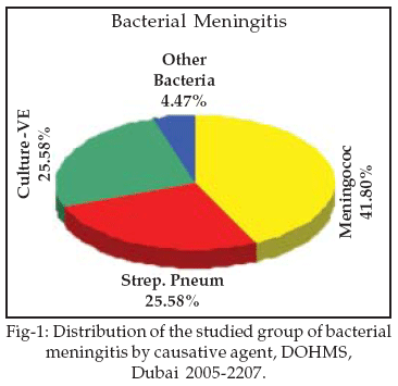 Out of the 134 patients, eighty six (64.17%) had bacterial meningitis whereas forty eight (35.82%) had viral meningitis. Among the 86 bacterial meningitis patients, Meningococci was isolated in thirty six (41.86%), Strepo.Pneumoniae in twenty two (25.58%), Staph.Aureus in two (2.32%), Klebsiella Pneumoniae in two (2.32%), Strept.Agalactiae in one (1.16%) and E.Coli in 1(1.16%) patient. In twenty two (25.58%) patients no organism was isolated (culture -ve bacterial meningitis) but CSF changes were suggestive of bacterial meningitis and these patients were treated with antibiotic (Fig-1). Out of the 64 culture positive bacterial meningitis patients, CSF Gram
