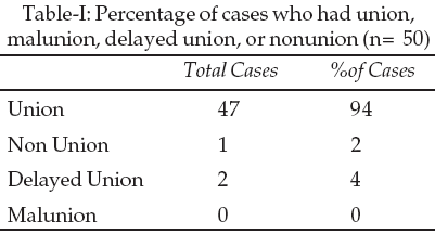 This descriptive study was carried out at Orthopaedic Department of ITTEFAQ Hospital Lahore. Forty patients were male and ten patients were females. All the patients were explained about treatment plan, cost of operation, hospital stay after surgery, complications of anaesthesia and their follow up after operation till the time of union. Examination of patients was done thoroughly at the time of admission to exclude other injuries.