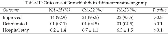 Table-III shows the outcome of bronchiolitis in different treatment group. All cases improved with time except three. Interestingly one case from each of the three groups needed intervention and was treated by broad spectrum antibiotic and one patient received steroid. No patient expired during treatment. Mean hospital stay was little longer in OA group (6.7±1.1) and shorter in NA group (6.2 ±1.4). However the difference in outcome in three groups was statistically insignificant.