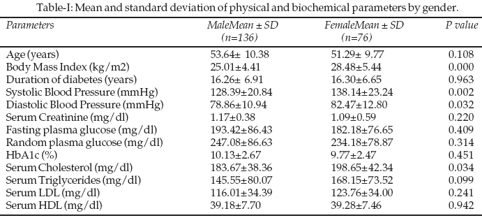 Two hundred fourteen patients were studied 63.5% (n=136) were males and the average duration of diabetes was 16.27±6.80 years. All physical and biochemical parameters are shown in Table-I. Most of the subjects had poor glycaemic control at presentation with a mean HbA1c of 10.03±2.69. Six (2.8%) patients died due to cardiovascular events. Gender differences existed for patients presenting with foot ulceration. Females had a higher BMI (P=0.0001), systolic (P=0.002) and diastolic (P=0.03) blood pressure and total cholesterol (P=0.03).