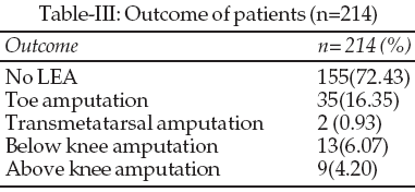 In accordance with the UT grading system seventeen (7.9%) patients were classified as grade one, one hundred thirty three (62.1%) as grade two and sixty four (29.9%) as grade three ulceration. Regarding type of foot ulcer 44% had neuropathic ulcer while 55.6% patients had non-ischeamic ulceration and <1% patient had pure ischeamic ulceration. Ulcers healed completely in 155 (72.43%) of patients and 59 (27.5%) underwent LEA. Table-II shows there is a significant increase in the amputation rate from grade one to grade three (P =0.001) with the majority of amputations being performed in patients with grade three ulceration (50.8%) followed by 45.7% in grade two and only 3.3% in grade one.