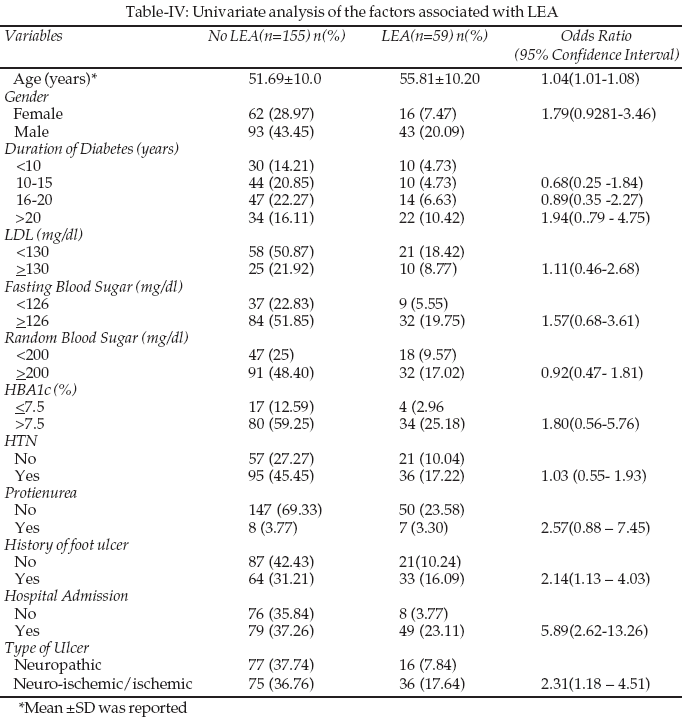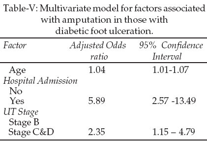 Table-IV shows univariate factors associated with LEA for diabetic foot ulceration include age, gender and history of foot ulceration, hospital admission, and grade of ulcer.