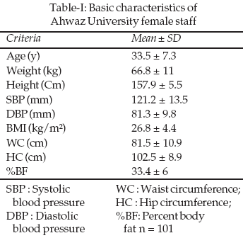 This cross- sectional study was performed on all one hundred one healthy women of 20-45 years who were working in administrative and managerial positions at Jondi-shapour University of Medical Sciences Central Building, Ahvaz, southwest of Iran located by the Persian Gulf. (Total number of female personnel was 105, but 4 women were excluded because of their illness). Data collection was carried out between March and June, 2005. Their anthropometric indices including body mass index (BMI), waist and hip circumferences (WC, HC), percent body fat (%BF), exercise pattern, semi-quantitative food frequency questionnaires (FFQ), drug and medical histories were collected by the trained senior students via interview. Waist circumference was obtained by measuring the distance around the smallest area below the rib cage and above the ambilicus with the use of a nonstrechable tape measure.