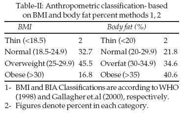 Women’s mean age was 33.5 ± 7.3 years (in the range of 20-45 years) and 62% of them were married. Table-I shows the basic criteria of the subjects. Table-II represents the thin, normal, over weight and obese subjects based on both BMI and BIA methods.