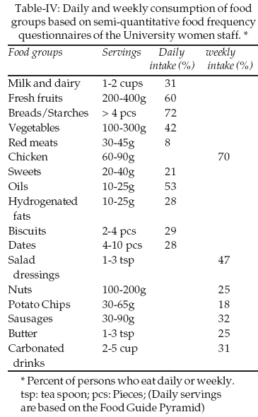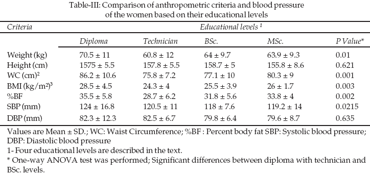 Both methods indicated that more than 60% of the women were overweight or obese and 27% had WC above 88 cm and 5% had hypertension. Table-III compares the various individual’s anthropometric criteria and blood pressure levels based on their educational levels. Women with high school diploma had the highest amounts of body weight (P= 0.01), WC (p=0.001), BMI (p=0.003) and %BF (p=0.002) compared with those of higher educational levels. FFQs showed that except breads and starchy foods, daily consumption of all main food groups was low in majority of women.