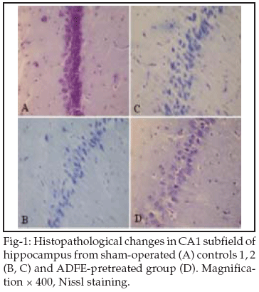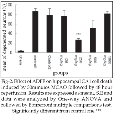 Methodology: Rats were fed with different doses of ADFE by gastric intubation daily for two weeks. After feeding, right middle cerebral artery was ligated for 30 minutes followed by 48 reperfusion. Then animals were sacrificed and brains removed for Nissl staining. Neuronal damage was then estimated in three distinct areas of CA1 of hippocampus subfield. After determination of ADFE optimal dose, immunohistochemistry was performed for p53 expression.