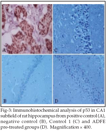 After determination of optimal dose of ADFE, to get a better insight on molecular mechanism underlying the neuronal death we studied the role of p53 in CA1 of hippocampus.Brain sections (five ìm) from paraffin-embedded tissue were dried overnight at 37ÚC, dewaxed in xylene and rehydrated through ethanol to Double Distilled Water (DDW). Before immunostaining, slides were totally immersed in boiling sodium citrate (pH 6.0) in a microwave plastic bowl and incubated for ten minutes plus ten minutes in microwave power. Then, sections were incubated with monoclonal antibody at 1:100 dilutions [DAKOTM, Code No. M 7001, Lot 056 at a dilution of 1:100] overnight at 4ÚC. After washing in Tris buffer, sections were incubated one hour with biotinylated secondary antibodies (Dako), followed by the incubation with avidin–biotin–horseradish peroxidase complex (Dako).
