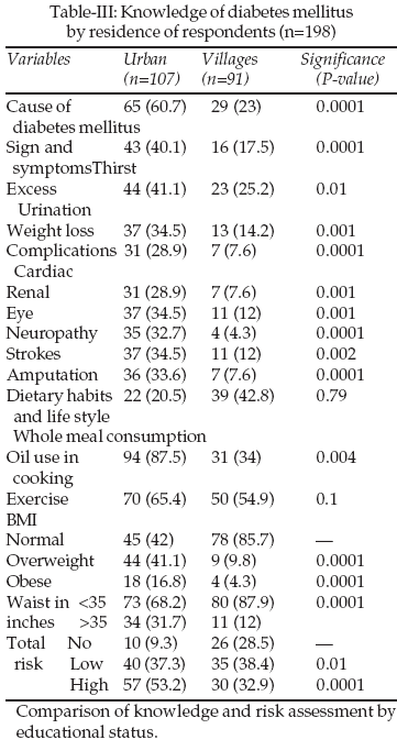 Table-III: shows responses to questions regarding knowledge of diabetes mellitus by place of residence. People living in urban area were found more knowledgeable about diabetes mellitus.