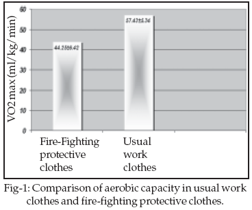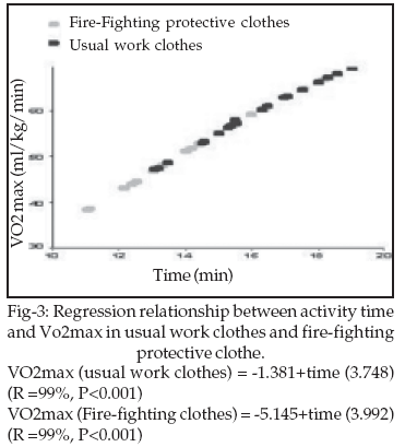 11 in this study, the predicted Vo2max in the group using fire-fighting protective clothes was significantly less than the group with usual work clothes. In practical terms what it is mean that, the person are likely to get tired soon. Mcllelan showed that in the Canadian chemical protective clothes, Vo2max was significantly less than usual work clothes.12 The result of our study with subjects wearing Iranian fire-fighting protective clothes are similar to these finding and show that protective clothes cause decrease in person’s tolerance and Vo2max.Some researchers did not introduce any specific physiological parameters on fatigue span while doing activity, and stated various physiological and psychological factors.