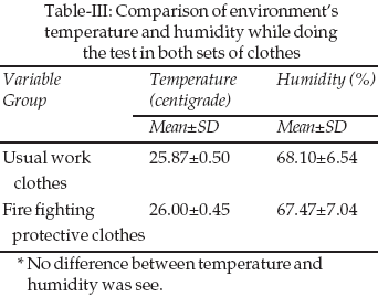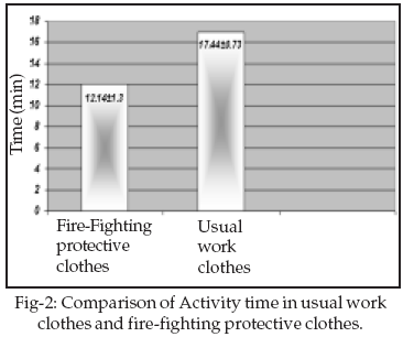 The activity time (fatigue time) of the participants in usual work clothes was 17.44±0.73 minutes and in fire-fighting protective clothes 12.14±1.3 minutes, which was statistically significant (p<0.001) Fig-2.