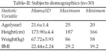 The participant’s features have been represented in Table-II. According to these result, the range of age 21.6±1.4 and mean of 22.44±2.24 BMI were under the investigation. Means of height and weight used in BMI survey were respectively 173.90±4.4cm and 67.72±5.93kg.