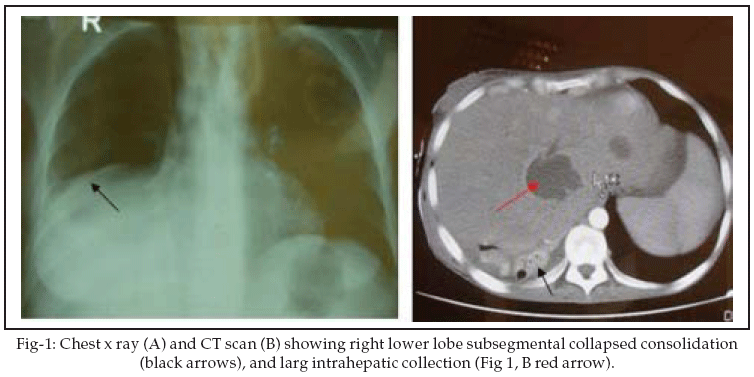 oC and oxygen saturation 94% on room air. Her chest examination revealed dullness on percussion and crackles at the right lower base. On abdominal examination, there were scars of previous abdominal surgeries and mild hepatomegaly but no signs of hepatic insufficiency or portal hypertension. The rest of her physical examination was normal. Laboratory evaluation revealed a hematocrit of 31%, white blood cell count of 13.500/mm3 with a predominance of neutrophils, and platelet count of 196000/mm.3 Her liver function tests showed a total bilirubin of 11.5mg/dl; with a direct bilirubin of 8.2mg/dl, serum alkaline phosphatase 1658U/l, γ-glutamyltransferase (γ-GT) 460U/l, and albumin 2.7mg/dl. The rest of her laboratory investigations including the transaminases, were all-normal. Urine analysis revealed bilirubinuria and absent urobilinogen. Blood and sputum cultures were negative for pathogenic organisms. Chest radiography and CT scan showed subsegmental collapsed consolidation in right lower lobe (Figure-1A and B, black arrows), and large intrahepatic collection (Figure-1B, red arrow).