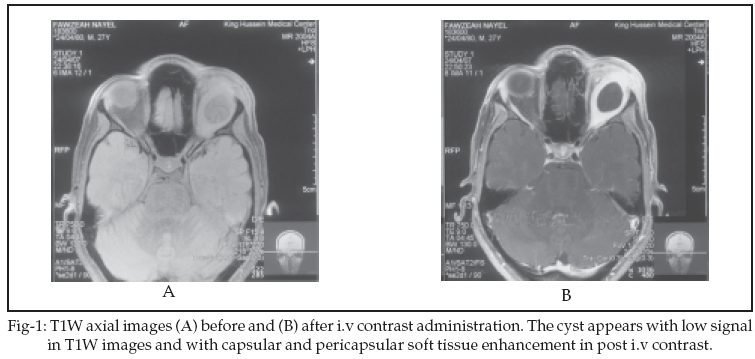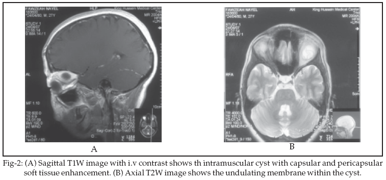 Orbital MRI was done which showed a 2 X 2cm well circumscribed, cystic lesion located solely in the superior rectus muscle. It appeared hypointense in T1W (Figure-1A) and hyperintense in T2W images with internal undulating hypointense membrane (Figure-2B). The internal undulating hypointense membrane is the characteristic appearance of hydatid cyst anywhere in the body. Following I.V contrast injection, the cyst showed thick enhancement of the capsule (Figure-1B, Figure-2A). The patient underwent surgical removal of the cyst by transcranial surgical approach. Post operative examination revealed no proptosis, residual limitation of upgaze occular movement. Postoperative MRI shows no evident of cyst residue.
