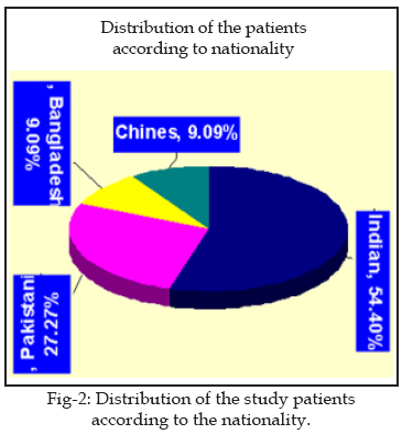 All the patients under study were male, laborers and expatriates who visited or lived in Dubai. Among the study patients, majority of them were Indian followed by Pakistani and other nationalities, Fig-2. Forty (90.9%) patients were working in construction companies, whereas four (9.09%) patients were gardeners. All the patients presented within 2-5 days of the development of symptoms.