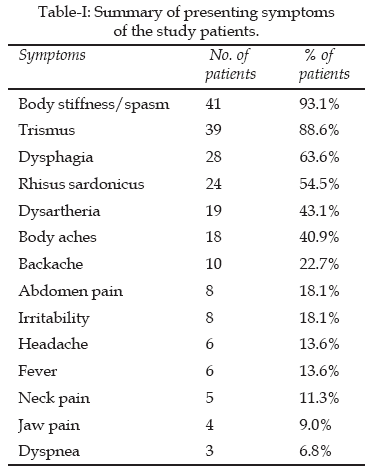 Results: A total of 44 patients were enrolled into the study. The mean age+SD of the patients were 26.3+5.8 years and all of the study patients were males. Thirty six (81.81%) patients gave the history of injury prior to onset of the symptoms, whereas eight (18.18%) patients were unable to recall any history of injury. All the study patients were laborers working in construction companies except for four who were gardeners. Body stiffness/spasm, difficulty in opening the mouth, difficulty in swallowing, body pain, neck pain and backache were the main presenting complaints. The patients with upper limb injuries had shorter incubation period and more severe disease with high frequency of autonomous nervous system insufficiency. Overall, hospital stay was 46.6+11.4 days. Forty (90.9%) patients required mechanical ventilation. The mean+SD ICU stay was 26.4+5.8 days and on weaning all the ventilated patients required tracheostomy. Eight (18.18%) patients died as a result of ventilator associated complications (Pneumonia) and autonomic nervous system dysfunction.