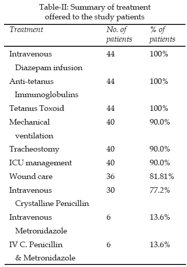 All the patients were managed as per standard protocol for the management of tetanus which included surgical toilet and/or detriment of wound, infusion of Diazepam, intravenous Crystalline Penicillin and/or Metronidazole, ICU care and mechanical ventilation (Table-II). Forty (90.09%) patients were admitted in the ICU and required mechanical ventilation. The mean+ SD ICU stay was 26.4+5.8 days and on weaning all the ventilated patients required tracheostomy. Four (9.09%) were treated pharmacologically without mechanical ventilation as these patients had mild disease and their mean+SD hospital was 18.5+4.3 days. Thirty six (81.8%) patients were discharged healthy except two who developed brain hypoxia and these patients were discharged with minimal neurological deficit. Overall, the hospital stay was 46.6+11.4 days. Eight (18.18%) patients died and six deaths were related to ventilator associated pneumonia leading to septicemia and multi-organ failure. Acinetobacter (2), Pseudomonas Aeuroginosa