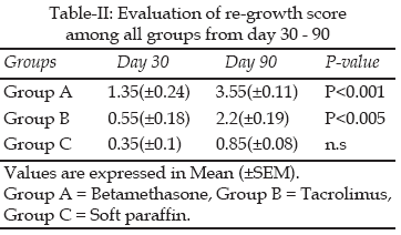 Sixty patients were selected for treatment, 20 in each treatment group. Four patients withdrew during treatment period and therefore failed to complete the study Reason for withdrawal was noncompliance. Patients in all three groups were matched for demographic characteristics. Demographic data and clinical characteristics at baseline are shown in Table-I. At week 12, the RGS was 3.55+0.11 in Betamethasone group (p<0.001), 2.2+0.15 in Tacrolimus group (p<0.005) and 0.85+0.08(ns) in control group respectively.
