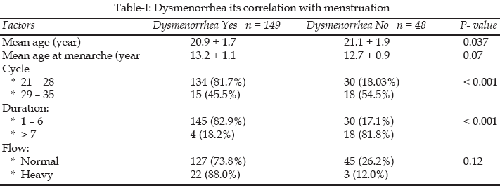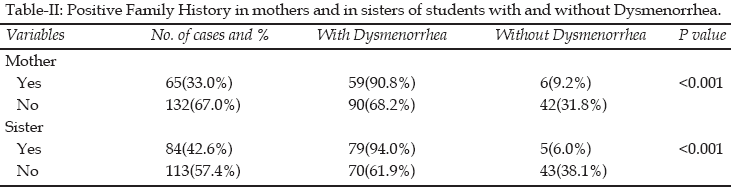 The data regarding positive family history of dysmenorrhea was collected by asking the presence of primary dysmenorrhea in mothers and in sisters in which 65 (33.0%) of mothers of these girls had positive history and 84(42.6%) of sisters were observed with dysmenorrhea Table-II.