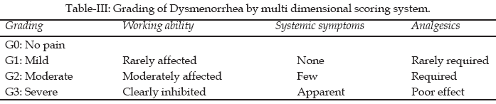 There was a group of participants 37 (24.83%) who had combined positive history in mothers as well as in sisters Table III. Severity of dysmenorrhea was assessed by grading and scoring of pain as G0 no pain, G1 mild 89(45.2%), G2 moderate 48(24.4 %) and G3 severe 12(6.1%). Majority of girls who experienced some degree of pain were in grade one to moderate grade two of dysmenorrhea.