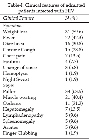 Results:Total 52 patients were admitted during the study period which included 50 (96.2%) males and two (3.8%) females. Mean age ± SD of the patients was 33.9 ± 9.5 years. Most common symptoms were weight loss in 31 (59.6%), fever in 22 (42.3%), diarrhea in 16 (30.8) and chronic cough in 15 (28.8%) patients while the commonest sign was pallor in 33 (63.5%) followed by muscle wasting in 21 (40.4%) patients. Hepatomegaly was found in seven (13.5%) and lymphadenopathy in five (9.6%) patients. Commonest risk factor indentified was history of blood transfusion in 48 (92.3%) patients followed by intravenous drug addiction in 19 (36.5%) and foreign travel in seven (13.5) patients.