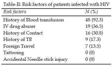 Commonest risk factor indentified was history of blood transfusion in 48 (92.3%) patients followed by intravenous drug addiction in 19 (36.5%) patients Table-II.