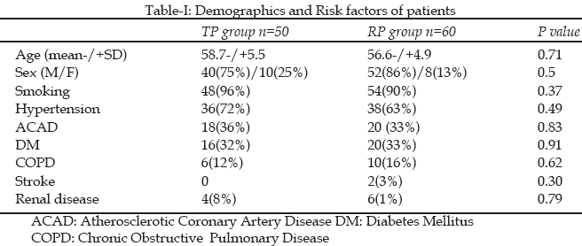 Both groups were compared for demographics and risk factors (Table-I). A significiant difference couldn’t be determined in the groups. Aortofemoral [RP 18 (30%), TP 10(20%)] and aortobifemoral [RP 42(70%), TP 40(80%)] procedures were performed. (Table-II) Statistically significiant difference wasn’t established in operative procedures between groups (p<0.818).