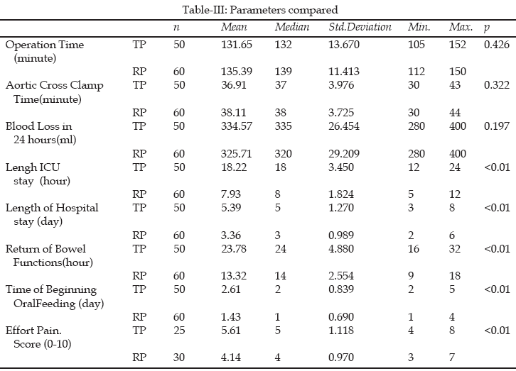 In the RP group the length of ICU stay (RP 7.93 hours vs TP 18.22 hours, p<0.01) and length of hospital stay (RP 3.36 days vs TP 5.39 days, p<0.01) were shorter than the TP group. In the comparision of return of bowel functions (RP 13.32 hours vs TP 23.78 hours, p<0.01) and time of beginning oral feeding (RP 1.43 days vs TP 2.61 days, p<0.01) a significiant difference was observed in RP group. Significiant difference was also observed in the comparision of effort pain score. In RP group mean pain score was 4.14 however in TP group pain score was 5.61 and p value was <0.01. In TP group coughing was more painful.